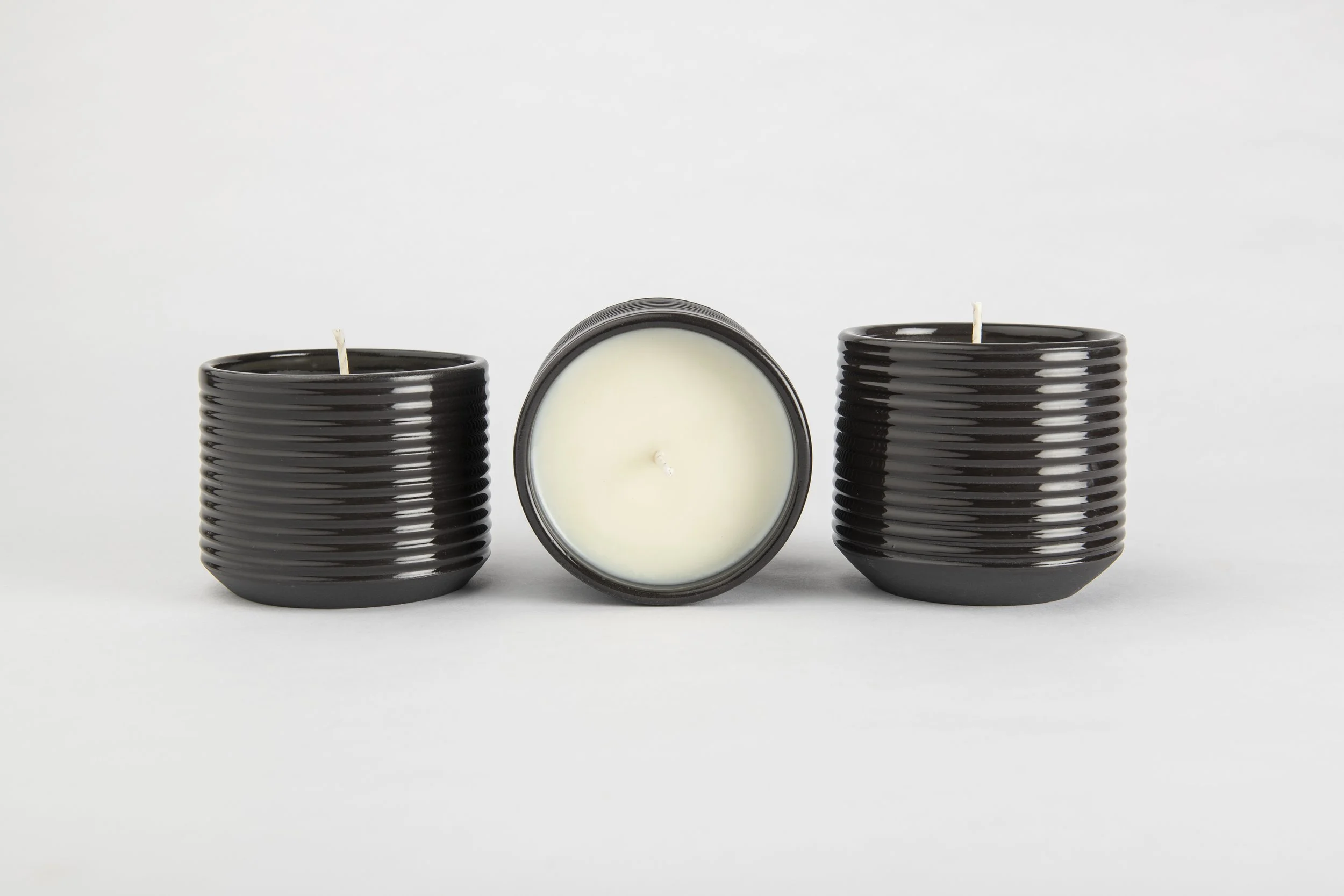 Hand Crafted with black porcelain. Wheel thrown and candles poured in Qatar.